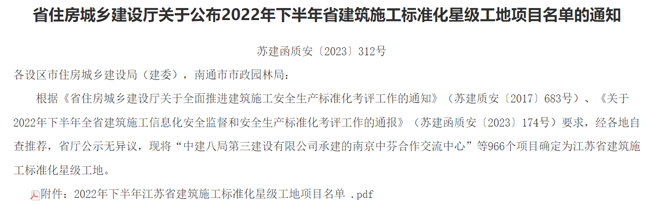 近期,省建設廳下發(fā) 《 關于公布2022年下半年江蘇省建筑施工標準化星級工地公示名單 》的通知,城發(fā)公司投資建設的青年公寓一期土建及安裝工程喜獲“江蘇省建筑施工標準化星級工地”(二星)稱號。該榮譽的獲得是公司扎實推進省安全生產(chǎn)標準化建設,落實上級關于推進安全生產(chǎn)標準化建設工作部署的要求,建立健全管理機制,積極開展安全文明標準化工地創(chuàng)建所取得的成果,為全省樣板化示范,有效提升建筑施工水平,安全生產(chǎn)發(fā)揮了引領作用。